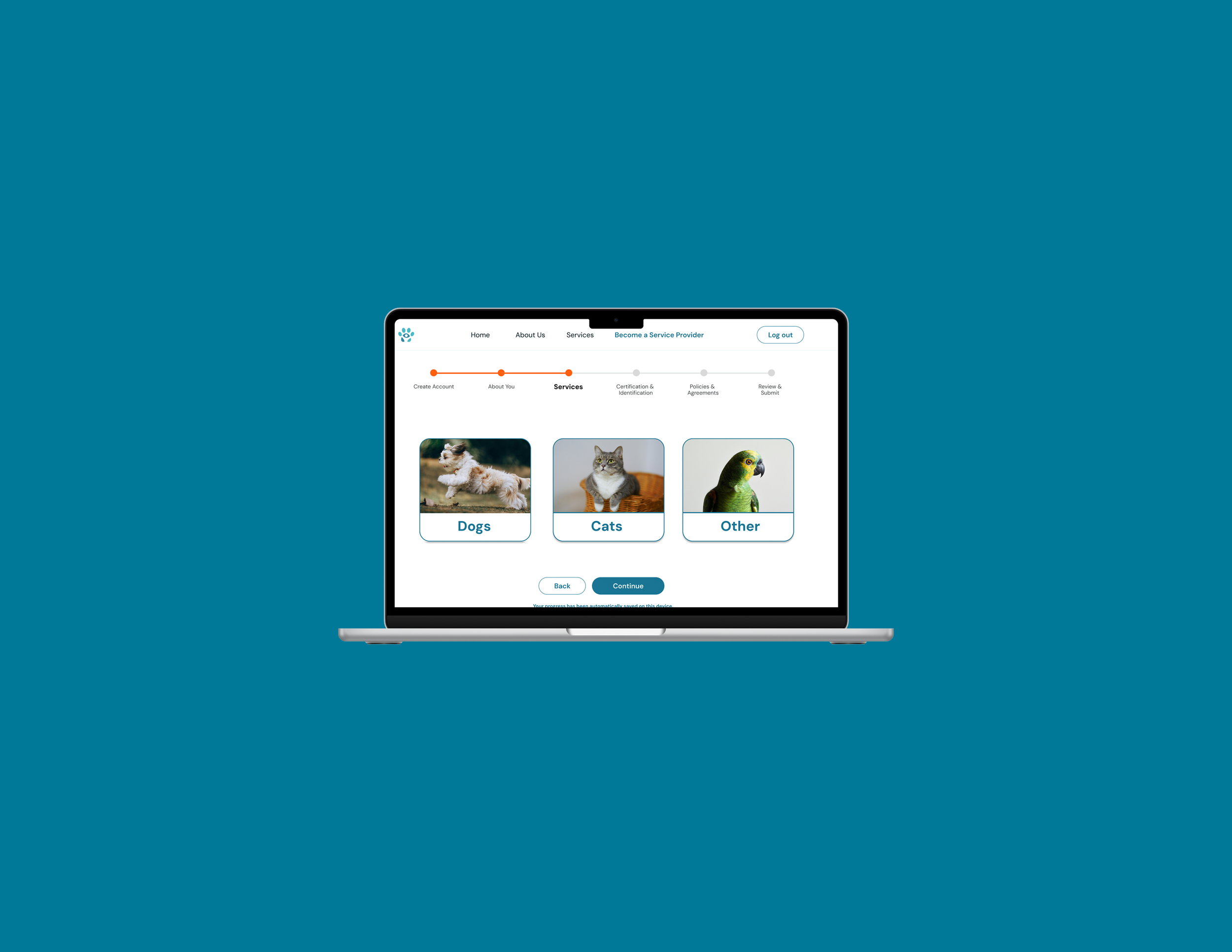 Design a pet provider process user flow so providers can sign up and become a pet provider if they wish, and have an easy process to follow to register as a pet provider. They need to be able to select the different types of pets they provide services for, and be able to track all of their bookings and their schedule for the bookings.