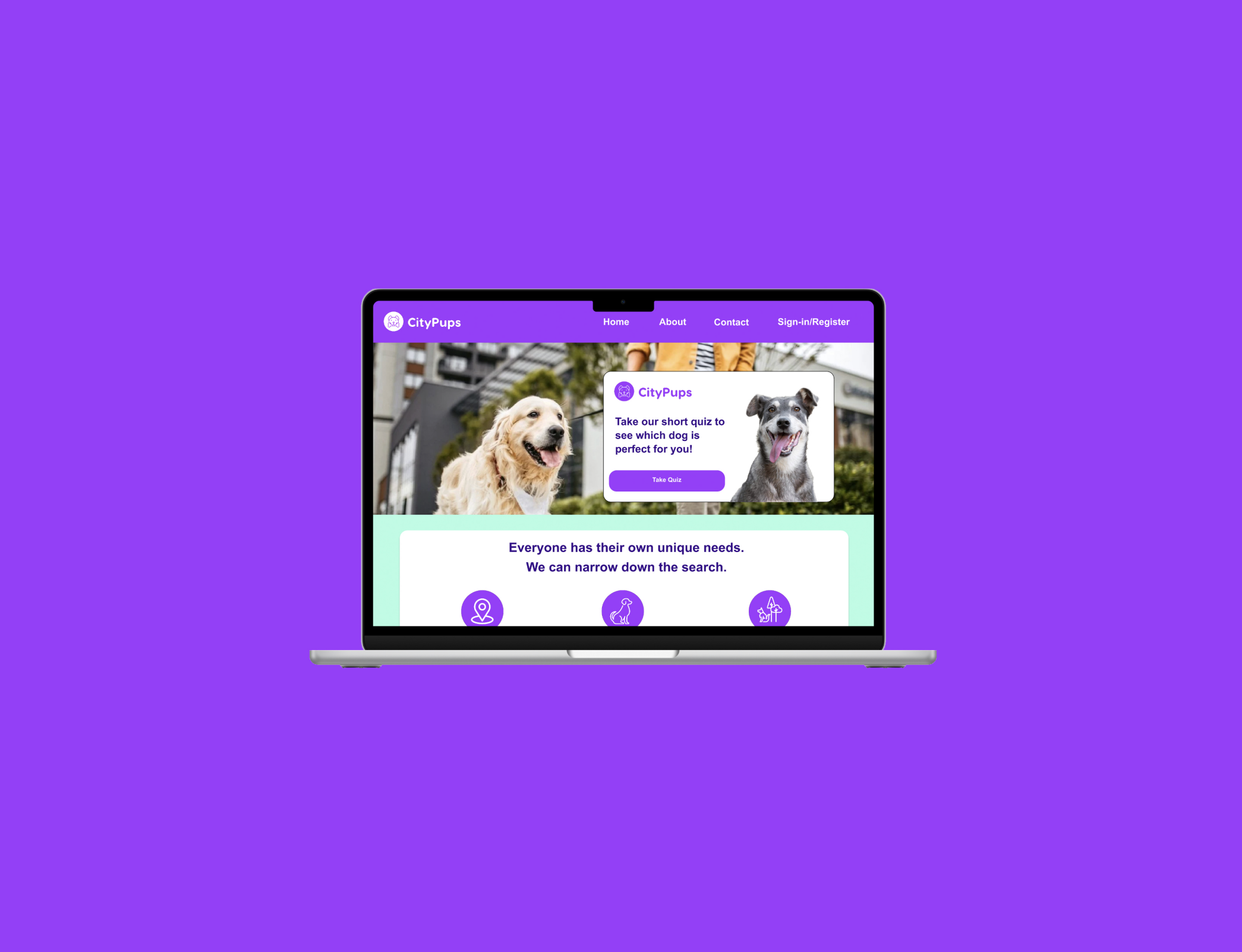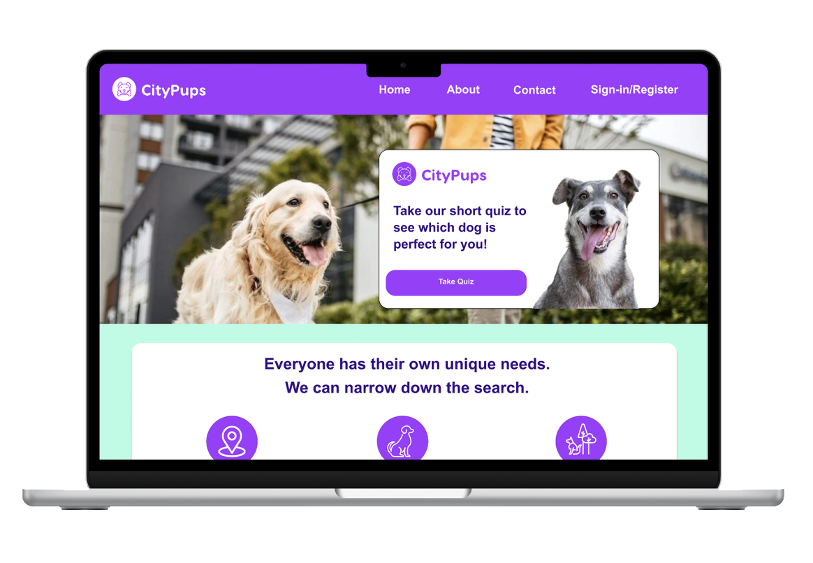 CityPups is a desktop website to help make the process of adopting dogs easier for people who live in cities. CityPups filters out the factors that will help users find the perfect dog to suit their needs in the city in which they live, from determining the space the user lives in and the personality they desire for their dog.