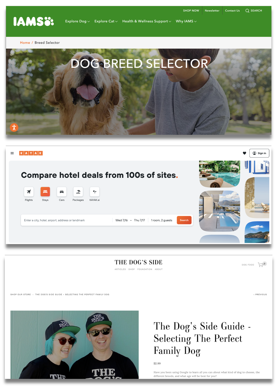On day 2 of the design sprint, research was conducted for a lightning demo, which involved looking at different products and websites that would help serve as inspiration for the CityPups website. Inspiration was taken from IAMS for their “dog breed selector” feature on their website and also for their personality of being a pet-friendly brand. Kayak also served as inspiration as it is a website that helps users filter out criteria and help make decisions with traveling. “The Dog’s Side” also served as inspiration as it involved dog adoption services.