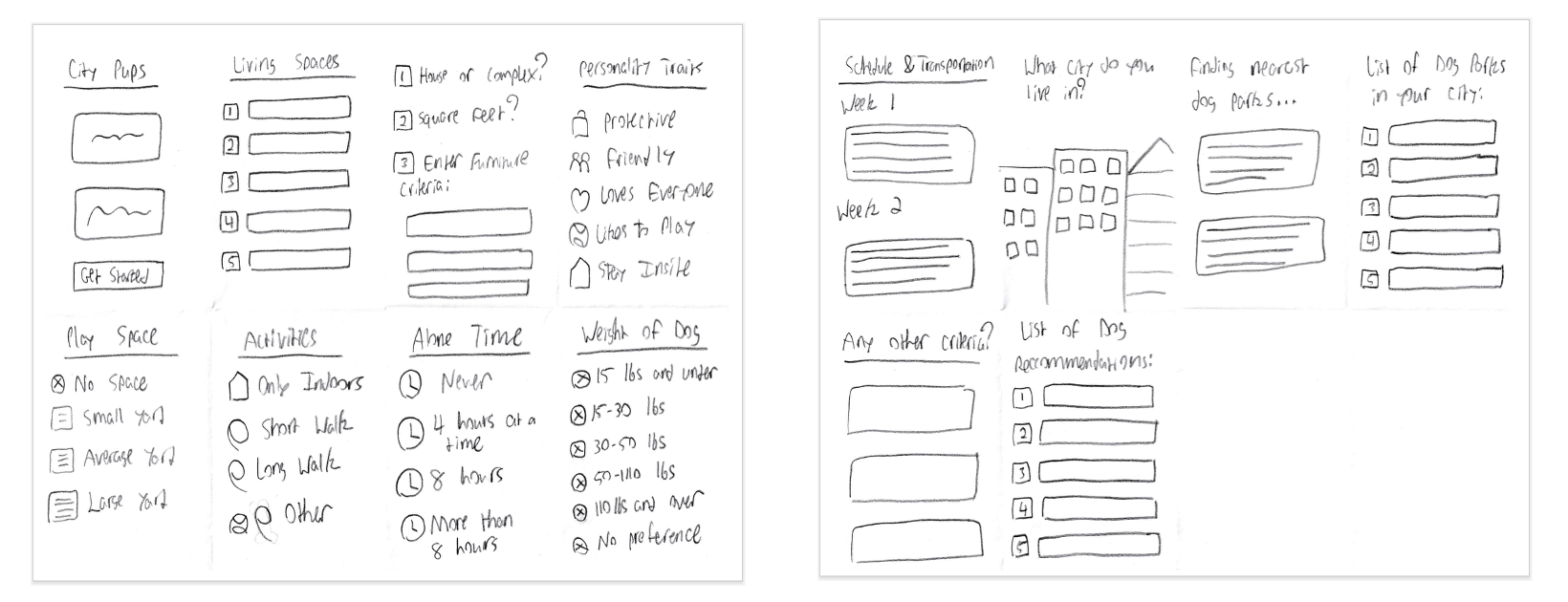 A Crazy8 sketch was then completed as a brainstorming exercise to see what possible solutions could be developed into a website that provides a quick and easy experience for city residents. I wanted the screens to be straightforward and nicely organized with the different questions, such as a person’s living spaces, their work schedule, how much outdoor space they have, which city they live in, and any other city-specific criteria that could help determine finding the right dog.